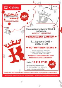 Warsztaty odbywać się będą 5 oraz 12 grudnia 2025 r., w naszej Pracowni Artystycznej przy ulicy Widok 4. Zapraszamy również na warsztaty, które odbywają się w Młodzieżowym Domu Kultury przy ulicy Grunwaldzkiej 5, w sprawie terminów prosimy o telefon do sekretariatu MDK 12 411 67 03.